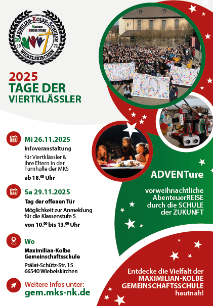 das Jahr 2025 neigt sich langsam dem Ende zu, was für uns bedeutet, bereits jetzt an das kommende Schuljahr 2026/27 zu denken. Wir laden deshalb expliziet Viertklässerinnen und Viertklässer und ihre Eltern zu unserem Informationsabend am 26. November 2025 um 18:00 Uhr in unsere Sporthalle ein. Für die Kinder wird unsere Schülervertretung ein kleines Programm auf die Beine stellen, während die Eltern über unsere Gemeinschaftsschule, ihre Möglichkeiten und Bildungswege sowie ihre Besonderheiten informiert werden.